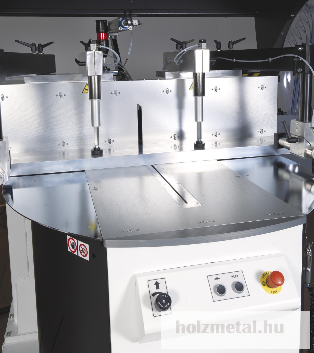 Edzett acél megmunkálásHáromfázisú motor teljesítménye 7,5 KwA lfűrészlap emelése golyóscsapágyas vezetőkön és kocsikonHidropneumatikus előtolásElektronikus befelé/kifelé forgatható fej 20°-tól jobbra 20°-ig szénkefe nélküli motorralA vágási ciklus indítása kétkezes biztonsági berendezéssel2db állítható pneumatikus függőleges bilincsek alacsony nyomású eszközzel2db állítható pneumatikus vízszintes bilincsek alacsony nyomású készülékkelAutomatikus zárás és nyitás - vágási terület védelmeMikroködös olajszerszám kenésElőkészítés görgős szállítószalag be- és kiadagoláshozForgácselszívó csatlakozó Ø120mmMozgatható konzolrendszer ipari PLC-vel, érintőképernyővel 8"USB csatlakozásTeljes mérete: 220x210x250 cmSúly : 1500 kg
