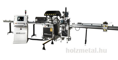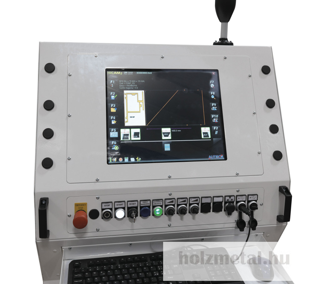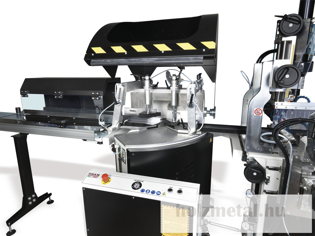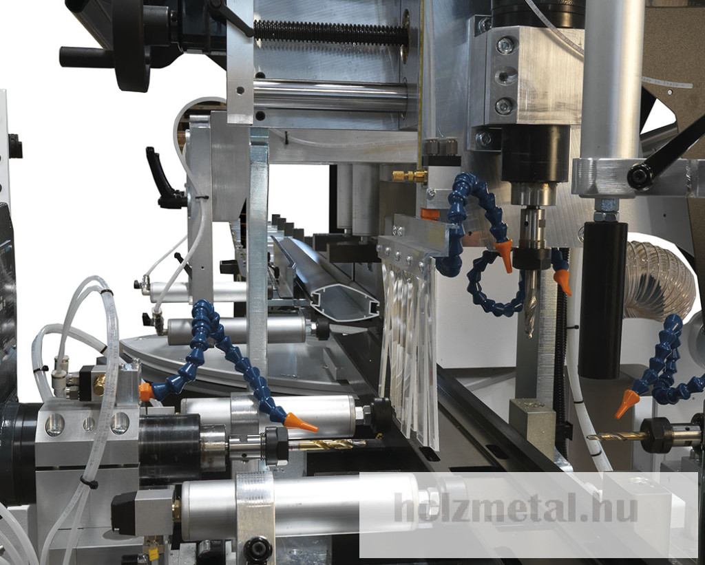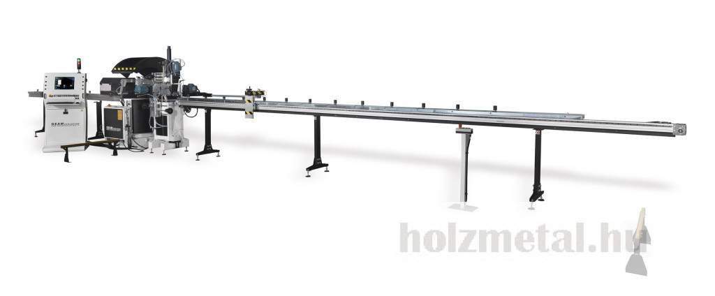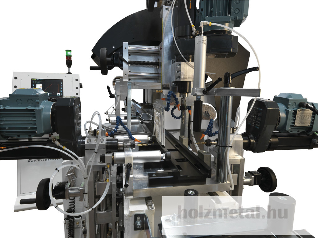 GEAM OCTOPUS TFFA gép 4 egységből áll:1 – Kézi rúdrakodó egységMegfogó a profil rögzítéséhez és kézi beállításhoz:Függőlegesen 0 és 210 mm közöttVízszintesen 0 és 150 mm közöttMéterenként 10 kg súly mozgatására képesAz előtolás változtatható előtolási sebessége 1 és 24 mt / 1 'között 0,4 KW motorralMaximális terhelhető profilhossz 6500 mm2 – Fúró- és menetfúró egységek3 – VágóegységFűrészgép 650 mm-es pengeemelésselPenge motor teljesítménye: 3 KWPenge fordulatszáma: 2800 fordulat / percA penge programozható elektronikus döntése 20° és 160° közötti szögbenOleopneumatikus lapelőretolásVízszintes pneumatikus bilincspár1 Pár függőleges pneumatikus bilincsA vágási terület integrált védelme4 – Kézi kiadagoló és tárolóegységMaximális kiradagolható profil 4000 mmÉrintőképernyős PC elektronikus vezérlőpanel TFT 17"Windows 10 rendszerProgramozási lehetőség:a) A penge dőlésszögeb) Fúrás és menetfúrásc) Előtolási sebességed) Munkák listájaVÁLASZTHATÓMotoros függőleges fúró/ellenfúró motoros egység helyzetjelzővelMotoros vízszintes fúró/ellenfúró motoros egység helyzetjelzővelMotoros függőleges motoros menetfúró egység digitális kijelzővelMotoros vízszintes motoros menetfúró egység helyzetjelzővelSzállítószalagPenge átmérője 650 mm.Több átmérőjű fúrófejTöbb átmérőjű menetfúró szerszámokTöbb átmérőjű marótárcsaVédőkertés